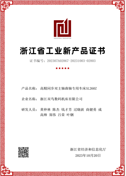 高精同步雙主軸曲軸專用車床SL260Z新產(chǎn)品評(píng)價(jià)證書